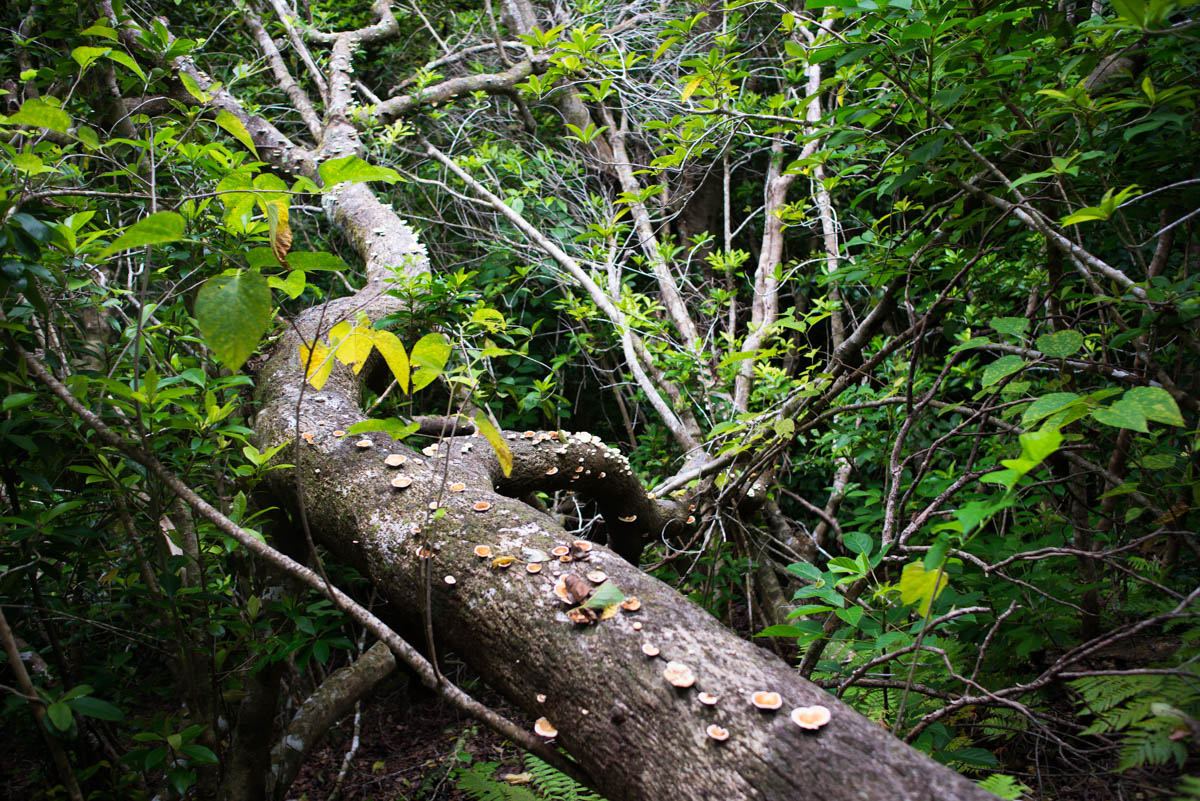 倒木にきのこが生える、そんな原生林を行きます。